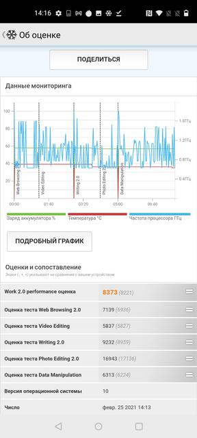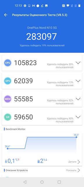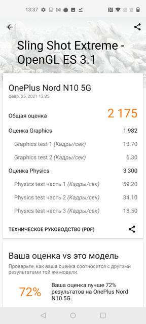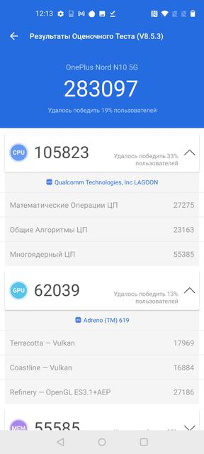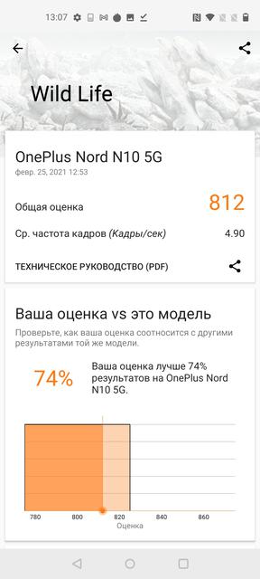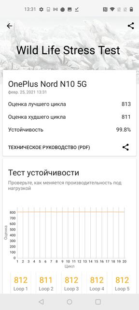 Непривычно, но этот OnePlus не претендует на борьбу со флагманами других производителей. Начинка, под стать ценовой категории, заметно скромнее. Смартфон построен на платформе Qualcomm SM6350 Snapdragon 690 5G. Это первая система на чипе среднего уровня с поддержкой 5G. Довольно производительный 8-нанометровый восьмиядерник с графическим ускорителем Adreno 619L. Звёзд с неба не хватает, но в тестах производительности показывает себя не хуже, чем иные конкуренты из 700-й серии. А в быту, при обычной повседневной эксплуатации, с головой хватает и менее производительных чипов. Приятно, что даже при высокой нагрузке аппарат почти не нагревается. Троттлинг наблюдается незначительный, всего до 90%, причем стабильный и без явной тенденции к дальнейшему понижению частоты.