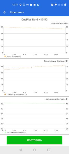 Автономность OnePlus Nord N10 5G составляет порядка 16 часов в условиях интенсивного тестирования PCMark Work 2.0. Это отличный результат, если учесть, что аккумулятор имеет далеко не рекордную ёмкость в 4300 мАч. Смартфон вполне может обойтись без одной ночной зарядки и проработать двое суток при умеренно активном использовании. Но интереснее то, что зарядка необязательно должна быть ночной. Строго говоря, любой смартфон необязательно заряжать именно ночью, но в нашем случае речь идет о поддержке быстрой зарядки Warp Charge, и зарядном устройстве соответствующего стандарта в комплекте. Полностью разряженный смартфон у меня набрал 57% ёмкости в течение 30 минут, а за час с небольшим зарядился полностью. Но нужно иметь в виду, что более простые зарядные устройства и кабели уменьшают космическую скорость зарядки до обычной, земной (менее 20% за полчаса). Беспроводные зарядные устройства этим аппаратом не поддерживаются.
