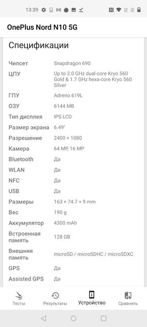 OnePlus Nord N10 5G доступен только в одной комплектации с 6 Гб оперативной памяти и 128 Гб постоянной. Последнюю можно расширить при помощи карты microSD, но она займет один из двух слотов гибридного SIM-лотка, и тогда не получится установить вторую симку.