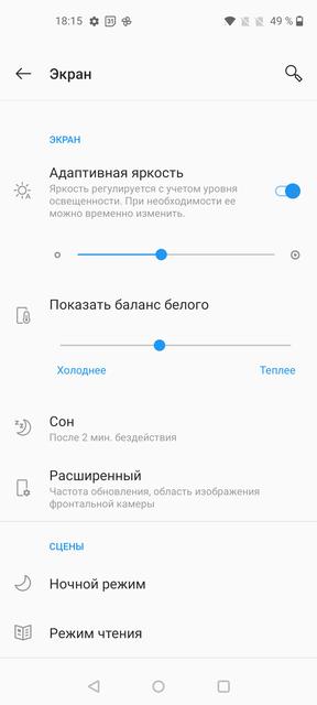 На уровне. 6,49-дюймовая IPS-матрица, широкоэкранное (20:9) разрешение 1080х2400, частота обновления 90 Гц. В качестве защитного покрытия используется Gorilla Glass 3. В общем, минимально приемлемый набор: поддержки HDR нет, режим Always On тоже не предусмотрен, да и конкуренты уже щеголяют 120-герцовыми экранами. Хотя, на практике нужно ещё постараться, чтобы почувствовать разницу. Кстати, отсутствие Always On частично компенсируется возможностью включить особый экран блокировки при движении. Когда вы берёте в руки смартфон, на чёрном экране контрастно отображаются часы, заряд батареи и уведомления. Выглядит почти как классический Always On, но экономит заряд аккумулятора. В настройках есть режим чтения и ночной режим с фильтром синих оттенков, его можно включать по расписанию.