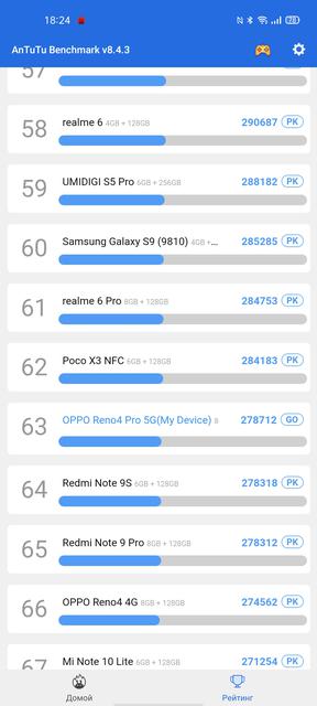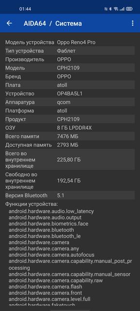 С начинкой OPPO Reno4 Pro ситуация интересная. OPPO Reno3 Pro выпускался в разных вариантах: с MediaTek и Snapdragon 765G, к нам возили последний вариант. OPPO Reno4 Pro также выпускается в двух вариантах, второй в названии имеет приставку 5G. И эти варианты довольно сильно отличаются. В 5G-версии используется тот же процессор Snapdragon 765G, "обычная" же версия получила чуть попроще Snapdragon 720G, у которого нет 5G модема. По производительности он самую малость отстаёт от Snapdragon 765G, хотя не думаю, что рядовой пользователь вообще заметит разницу. Если уже начали об отличиях, то 5G-версия также отличается стеклянным задником, наличием стереозвука и основной камерой, которая включает три более интересных модуля, чем наш "подопытный" OPPO Reno4 Pro.