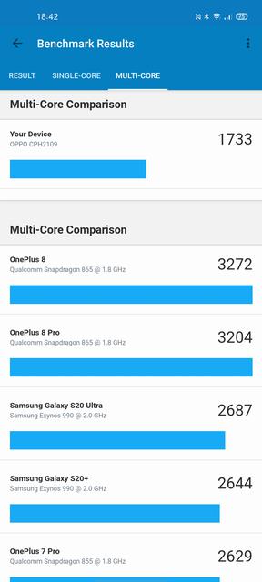 Но вернёмся к его начинке. Qualcomm Snapdragon 720G нам уже хорошо знаком: он производится но 8-нм техпроцессу, включает в себя два ядра Kryo 465 Gold по 2.3 ГГц и шесть Kryo 465 Silver по 1.8 ГГц и графический ускоритель — Adreno 618. Процессор себя показал как очень удачное и энергоэффективное решение среднего ценового сегмента с достаточной в большинстве случаев производительностью. Оперативной памяти — 8 ГБ LPDDR4x, встроенной — 256 ГБ UFS 2.1, есть отдельный слот для MicroSD. Результаты в бенчмарках вполне ожидаемые, типичные для современных смартфонов среднего сегмента.