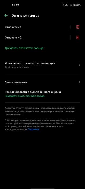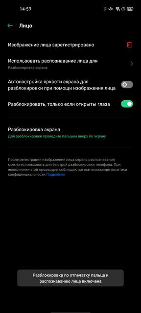 По разблокировке смартфона используется уже стандартный на сегодняшний момент комплект из подэкранного сканера отпечатков пальцев и распознавания лица фронтальной камерой. Сканер используется оптический, особенности которого мы уже давно знаем. Он подсвечивает палец во время сканирования и не работает с мокрыми пальцами. Смартфон в данном случае не защищён от воды, так что его мокрыми руками брать и не стоит. В остальном реализация сканера на привычном хорошем уровне: срабатывает точно и быстро, но по скорости по-прежнему малость уступает классическим вариантам. Распознавание лица при достаточном количестве света работает очень быстро. При плохом освещении скорость заметно снижается, даже при активированной функции автоповышения яркости дисплея для подсветки лица. Функция нераспознавания при закрытых глазах тоже присутствует.