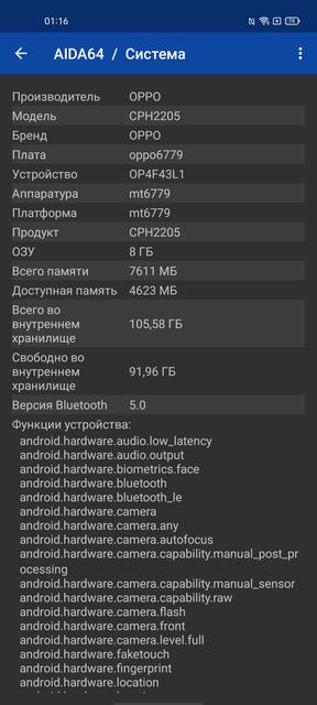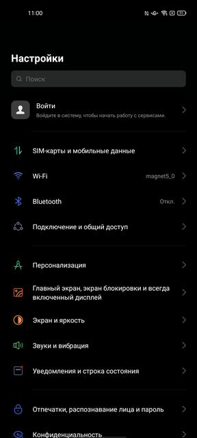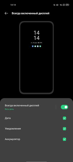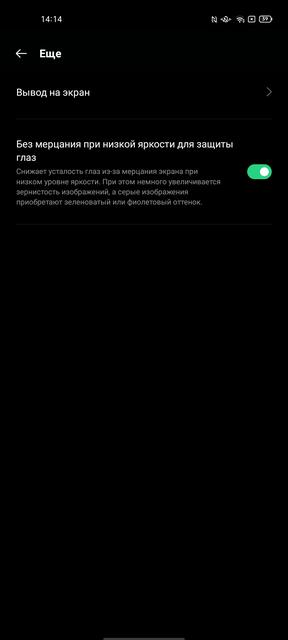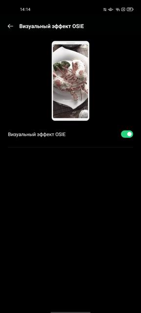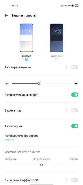 В настройках экрана есть тёмная тема интерфейса, возможность настройки масштаба интерфейса, размера шрифта, фильтра синего. Есть функция уменьшения мерцания при низкой яркости и "визуальный эффект OSIE". Присутствует во всех смартфонах OPPO, но каких-то явных улучшений картинки заметить не удалось. Разных режимов цветопередачи нет, но есть настройка цветовой температуры.