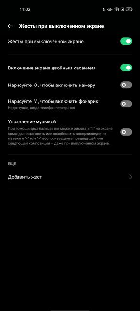 Помимо трёх вариантов навигации по системе (полноэкранные жесты, кнопки и жесты от нижней части экрана), есть дополнительные жесты для быстрого включения камеры, фонарика или переключения треков в плеере на выключенном экране. А также есть бесконтактные жесты. Точнее пока всего один, как и в прошлой версии оболочки. Движением руки перед фронтальной камерой можно ответить на звонок. Работает пока не слишком точно. Возможно в будущем появятся и дополнительные жесты.
