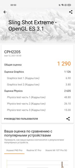 По начинке OPPO Reno5 Lite полностью повторяет своего предшественника. "Железо" абсолютно идентичное: в качестве процессора установлен MediaTek Helio P95 (MT6779). Это — 12-нанометровый процессор, который включает в себя 2 ядра Cortex-A75 с частотой до 2.2 ГГц и 6 ядер Cortex-A55 до 2.0 ГГц, за графику отвечает ускоритель PowerVR GM 9446. В целом, данного процессора хватает для стабильной работы оболочки и приложений. Но если смартфон планируется использовать и для игр, то стоит посмотреть что-то другое. К примеру, на 700-й серии процессоров Qualcomm Snapdragon. Оперативной памяти — 8 ГБ LPDDR4X, встроенной — 128 ГБ UFS 2.1. Результаты в синтетических тестах довольно скромные, что ожидаемо.