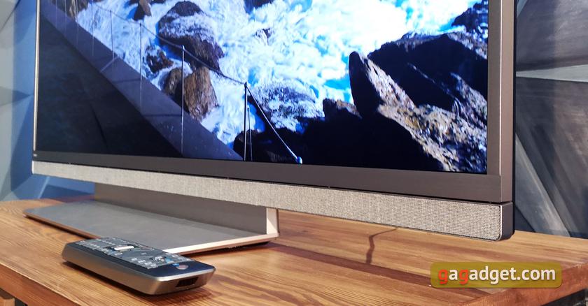 Саундбар сделан во всю ширину корпуса телевизора. Отделка сделана из специальной ткани Soft Cells, которая специально разработана датской компанией Kvadrat для использования в акустике. Она светло-серого цвета, отлично подходит под серебристую металлическую переднюю панель телевизора: