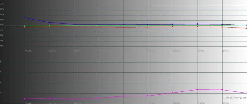 Заявлены показатели яркости 250 и 400 кд/м2 в SDR и HDR-режиме соответственно. Замеры показали, что реальный запас яркости даже чуть больше, чем обещал производитель. В обычном режиме максимальная яркость составила 265.092 кд/м2, а статическая контрастность 989:1. В HDR — чуть больше заявленных 400 кд/м2. Самая близкая к эталонной цветопередача в режиме "Ночной" с сертификацией ISF (Imaging Science Foundation), при этом цветовой охват близок к sRGB.
