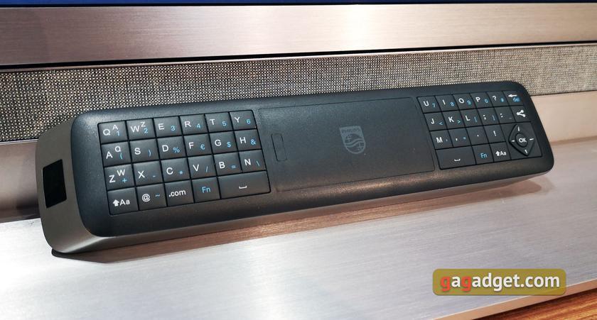 Пульт ДУ аналогичен младшей модели. Он крупный, с одной стороны — привычные для телевизоров органы управления, включая отдельные кнопки для управления плеером плюс кнопка для запуска Google Ассистента, микрофон для голосовых запросов и светодиодный индикатор его работы. На обратной стороне — QWERTY-клавиатура, которая разделена пополам для удобного набора большими пальцами.