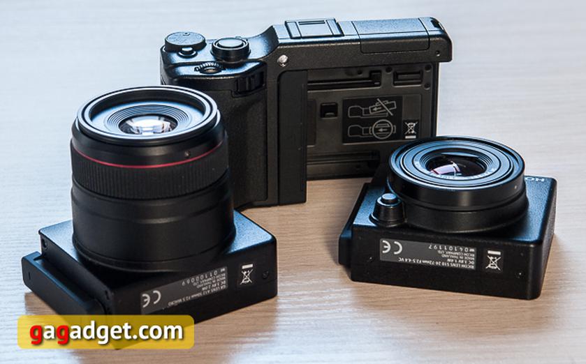 Базовый блок камеры представляет собой компактное устройство, которое содержит аккумулятор, очень качественный 3-дюймовый IPS-экран с разрешением 640х480 пикселей (920 тысяч точек), разъём для карты памяти и органы управления. Всё остальное находится внутри сменных модулей. Кстати, корпуса базового блока и модулей сделаны из крашеного магниевого сплава, а наплыв под руку оклеен мягким резиноподобным материалом.