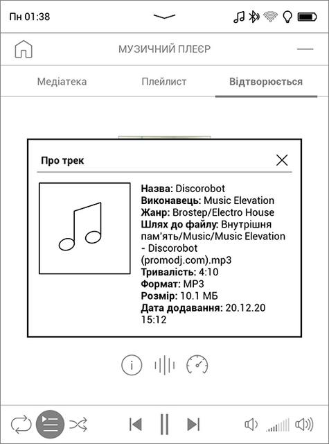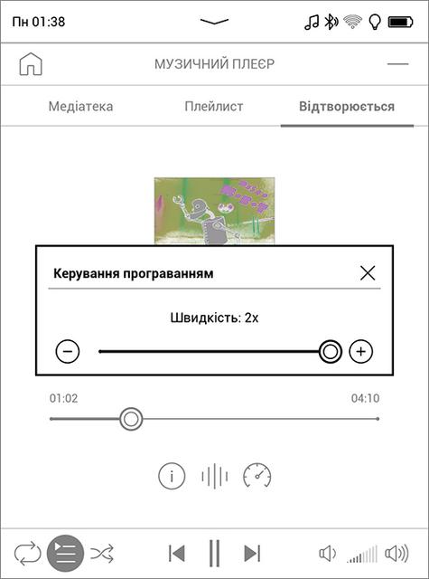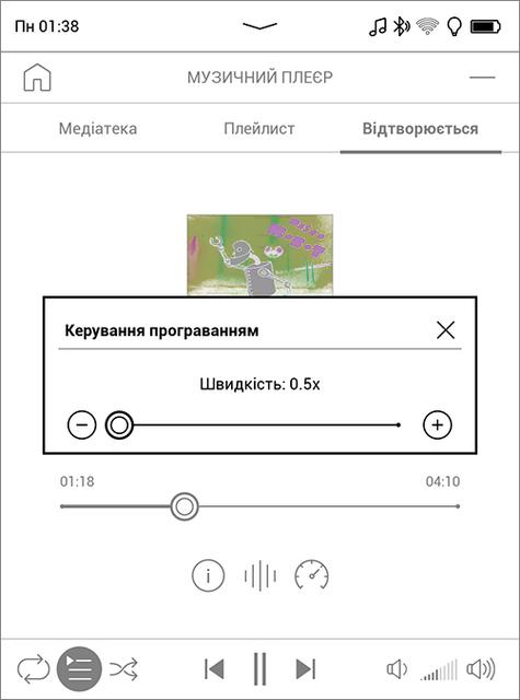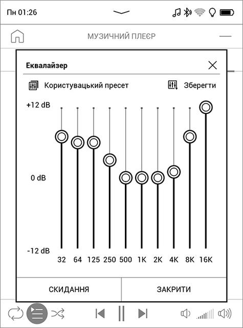 Помимо чтения (или прослушивания) книг в текстовых форматах, можно слушать аудиокниги, музыку, подкасты и любые другие аудиофайлы поддерживаемых форматов, причем для аудиокниг есть своё приложение с доступом с главного экрана и своим отдельным каталогом, а для прочих звуковых файлов - отдельный проигрыватель в разделе "приложения". Динамика у ридера нет, нужно подключать наушники или колонки – проводные, подключаемые к разъёму USB через переходник, либо беспроводные (через Bluetooth). В устройстве "из коробки" есть две аудиокниги и три классических музыкальных произведения. Качество звучания - на уровне бюджетных смартфонов, не особо требовательного слушателя устроит. Точнее подстроить звук под ваши наушники и ваш слух поможет десятиполосный экалайзер. Оба проигывателя можно свернуть, они умеют работать в фоновом режиме и управляются по Bluetooth.