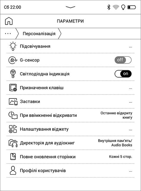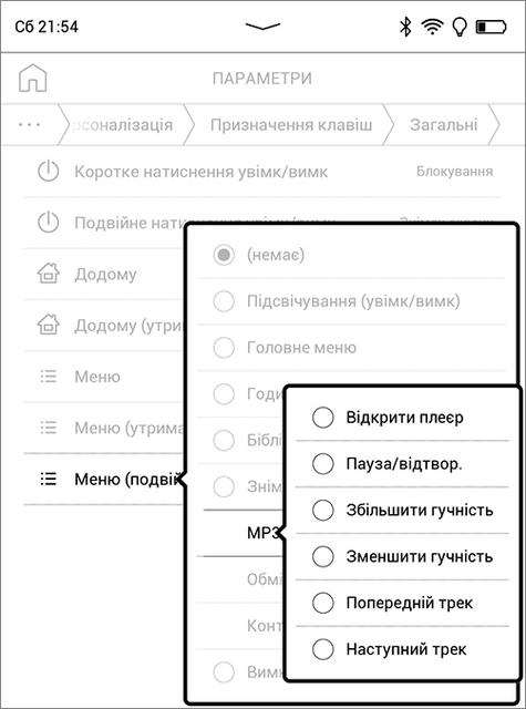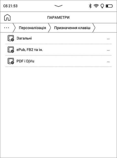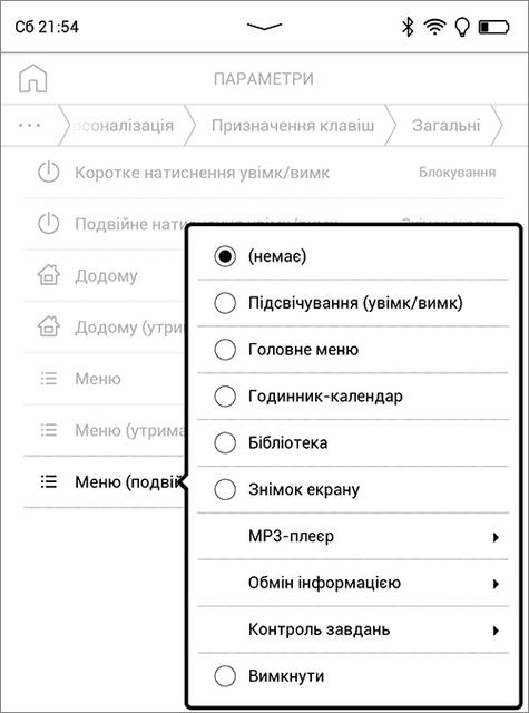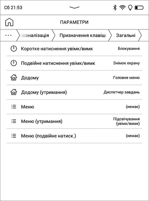 Для некоторых операций можно использовать и механические кнопки. Две средние в режиме чтения листают страницы книги, а также используются для навигации в библиотеке и других разделах интерфейса, где могут заменять скроллинг и кнопку "Назад" (но не всегда). Крайняя левая – это кнопка "Домой", при её нажатии с удержанием по умолчанию открывается диспетчер задач. Крайняя правая – "Меню", на главном экране она открывает панель настроек и уведомлений, а в режиме чтения – соответствующую панель инструментов и настроек. При работе с библиотекой, настройками и дополнительными функциями не получится обойтись одними кнопками – они не дублируют такие действия, как выбор и открытие книги, приложения или пункта меню. В разделе настроек "Персонализация" есть возможность назначить дополнительные функции на длительное или двойное нажатие кнопок "Домой" и "Меню", а также кнопки питания. Для режима чтения настраиваются функции кнопок "влево/вправо", причем отдельно для текстовых форматов и отдельно для PDF и DJVU. Вообще здесь уделено много внимания персонализации - настраивается практически всё: