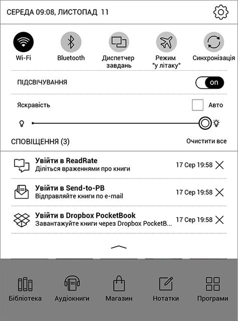 Строка состояния вверху дисплея раскрывается жестом вниз или просто касанием. Тут всё как у смартфонов - и быстрые настройки, и уведомления от системы и подключенных сервисов. Здесь же регулируется или отключается подсветка, есть автоматическая регулировка яркости.