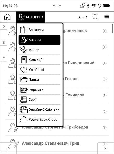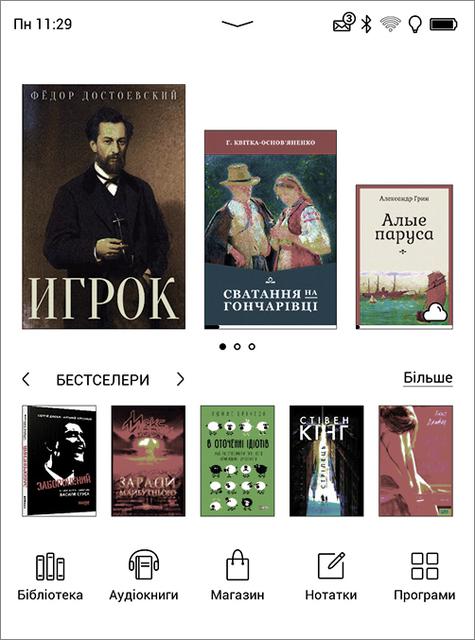 Как уже упоминалось, в устройство загружена довольно большая библиотека, состоящая из легально бесплатных произведений на русском, украинском, английском, немецком и французском языках. В основном это классика, срок действия авторских прав на которую уже истёк.