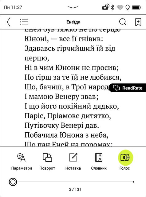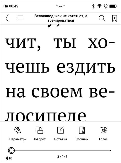 Здесь есть всё необходимое. Регулировка размера шрифта в больших пределах, выбор ориентации экрана, заметки, словари и чтение голосом (Text-to-Speech) с регулировкой скорости. Можно подчеркивать и обводить слова и фрагменты текста, рисовать на полях и добавлять комментарии.