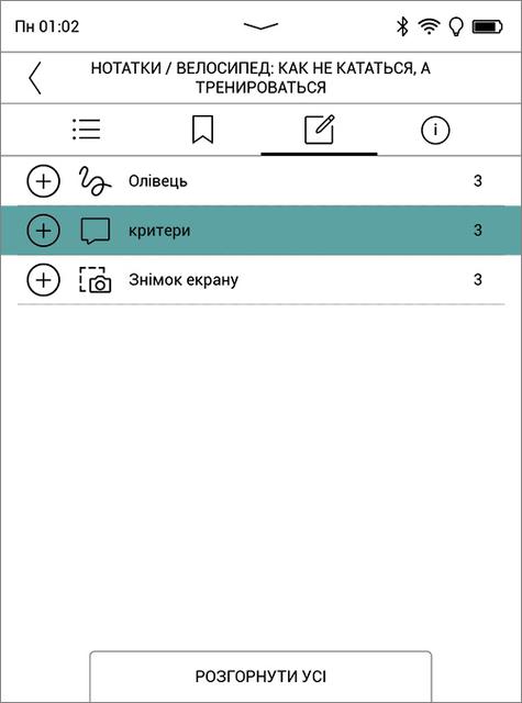 Для каждой книги можно просмотреть ее оглавление, закладки, заметки и свойства файла, а также выставить статус и рейтинг, если подключен сервис ReadRate. На основе этих данных составляются рекомендации, которые при наличии интернет-соединения ежедневно приходят на устройство в виде уведомлений. Все книги, которые хоть раз были открыты, синхронизируются с облаком PocketBook и становятся доступны с других устройств с установленным приложением PocketBook.