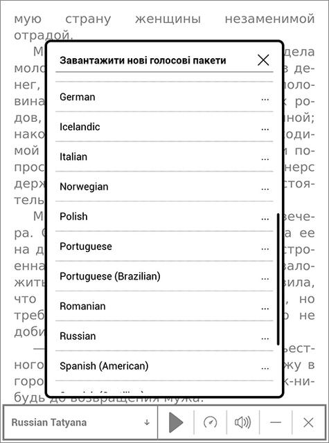 Чтение голосом работает очень даже неплохо, доступны для загрузки голосовые пакеты на 23 языках, в том числе на русском и английском, украинского пакета в списке нет. Впрочем, если послушать украинский текст в русской озвучке, то оказывается, что те буквы, которые есть только в украинском – і, ї, є – распознаются и произносятся правильно по-украински, а те, которые звучат в русском и украинском языках по-разному – трактуются как русские. Привыкнув к этой особенности, украинские тексты вполне можно слушать и так, если не удалось найти аудиокнигу.