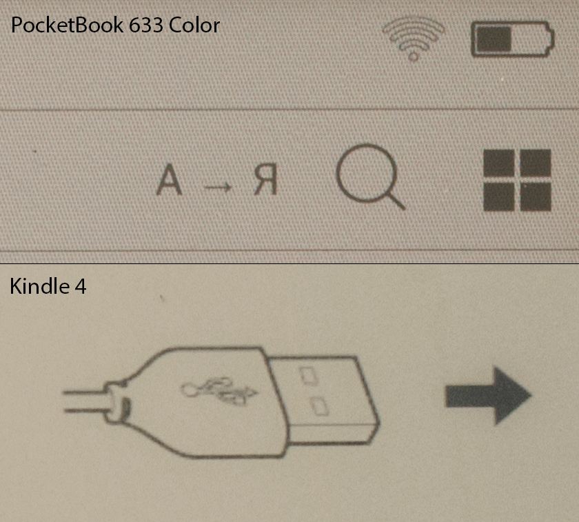 Без подсветки цвет никуда не девается, но ее приходится использовать практически всегда, в том числе и для текста, поскольку из-за дополнительного слоя с фильтром дисплей намного темнее, чем у современных монохромных моделей. У меня под рукой нашелся только старенький неисправный Kindle 4, но даже его экран заметно светлее.