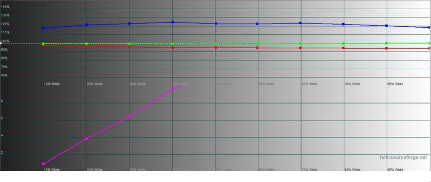 Замеры показали, что в "Великолепном" режиме максимальная яркость составила внушительные 447.042кд/м². Цветовой охват близок значительно шире sRGB, что нормально для AMOLED-дисплеев. При этом, картинка ощутимо уходит в холодные оттенки из-за переизбытка синей составляющей. Есть ручная регулировка цветовой температуры, так что можно откорректировать: