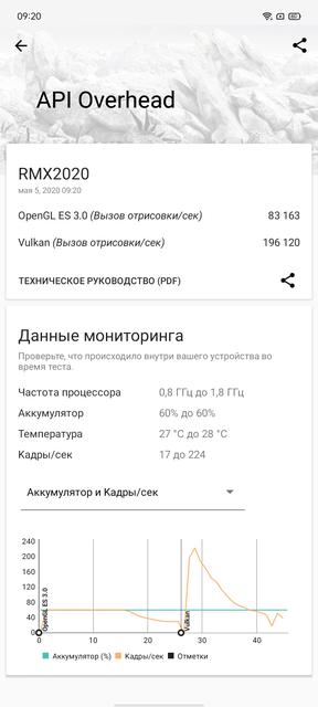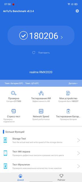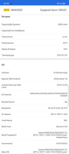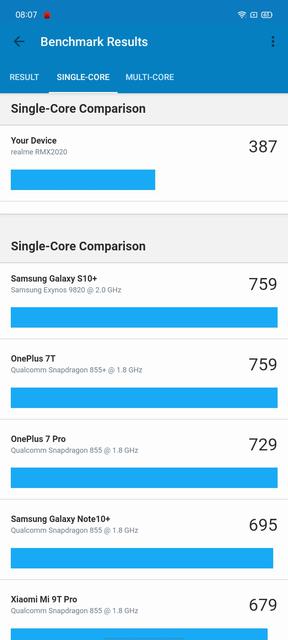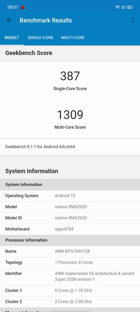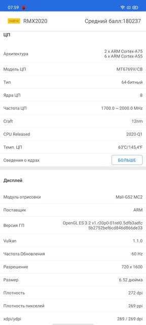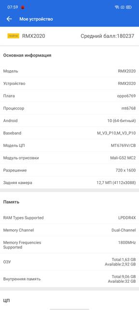 realme C3 — первый смартфон на процессоре MediaTek Helio G70. Сам же процессор был анонсирован в январе этого года. Он действительно позиционируется как недорогое игровое решение. Судя по характеристикам, игровым в полной мере его назвать сложно. Хотя в разрезе бюджетных смартфонов, да ещё и с разрешением дисплея HD+, он выглядит вполне неплохо. Интересный момент заключается в том, что по своим спецификациям он практически полностью совпадает с Helio P65, который был представлен прошлым летом. Процессор изготовлен до 12-нм техпроцессу и включает в себя два ядра 2 ядра Cortex-A75 по 2.0 ГГц и 6 ядер Cortex-A55 по 1.7 ГГц. За графику отвечает ускоритель Mali-G52 2EEMC2 с частотой до 820 МГц. У нас на обзоре была версия с 3 ГБ ОЗУ и 32 ГБ встроенной памяти. В бенчмарках смартфон демонстрирует весьма неплохие, как для бюджетника результаты.