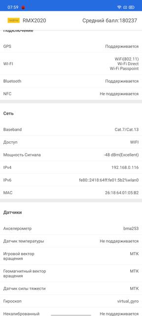 Из беспроводных интерфейсов есть Wi-Fi 802.11 b/g/n (однодиапазонный), Bluetooth 5.0 LE с поддержкой aptX, FM, поддерживаются глобальные системы позиционирования GPS, ГЛОНАСС, Beidou. В нашей версии на 32 ГБ встроенной памяти. Это очень мало по нынешним меркам, даже учитывая наличие отдельного слота для MicroSD. NFC-модуль отсутствует, но он есть в варианте на 3/64 ГБ. Так что есть ещё одна объективная причина присматриваться именно к старшей конфигурации. Внешний динамик один, его громкость и качество не впечатляющие, но вполне достаточные. То же самое можно сказать и про звук в наушниках. Разговорный динамик также имеет достаточный запас громкости. Для разблокировки смартфона предусмотрен стандартный набор: сканер отпечатка пальцев сзади (работает отлично) и распознавание лица владельца силами фронталки. Тоже работает очень неплохо. Как и в старших моделях, есть функция автоповышения яркости дисплея для лучшей подсветки лица при недостаточной освещённости и опция, при включении которой лицо с закрытыми глазами распознаваться не будет.