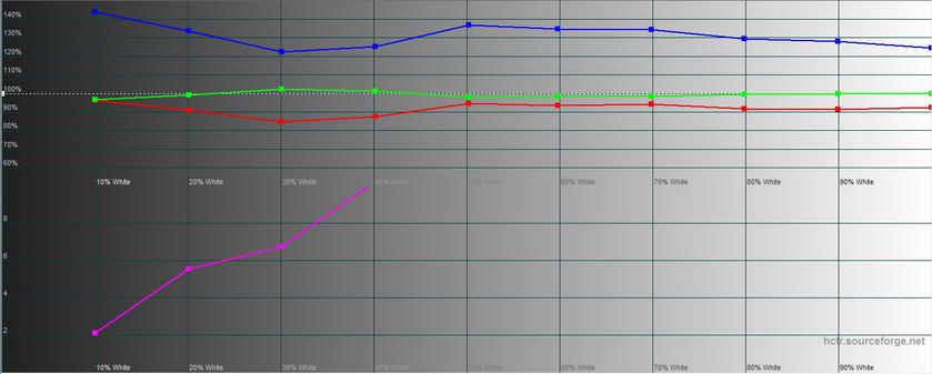 По результатам аппаратных замеров, максимальная яркость дисплея составляет 421.453 кд/м², яркость чёрного поля — 0.409 кд/м², а статическая контрастность — 1030:1. Цветовой охват почти совпадает с sRGB, но цветовая температура несколько выше эталонного значения: 8000К (при эталонных 6500К). Экран немного уходит в холодные оттенки из-за переизбытка синей составляющей: