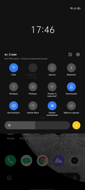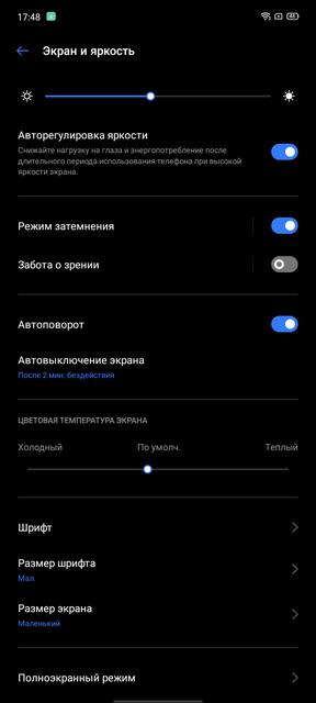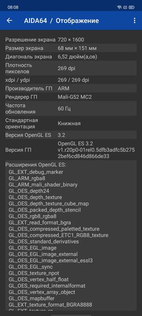 В смартфоне установлен IPS-дисплей с диагональю 6.5 дюйма и соотношением сторон 20:9. Разрешение — "бюджетное" HD+, в данном случае это 1600x720. Пиксельная плотность составляет около 270 ppi. Судя по всему, установлена такая же матрица, как и в более дорогом realme 6i. И, особенно учитывая стоимость смартфона, экран весьма хорош, как по цветопередаче и углам обзора, так и по запасу яркости: информация на солнце вполне читаема. Излишней "зернистоисти" тоже не наблюдается. В настройках есть всё необходимое: масштаб интерфейса, шрифта, тёмная тема интерфейса, фильтр синего (защита зрения) и регулировка цветовой температуры.
