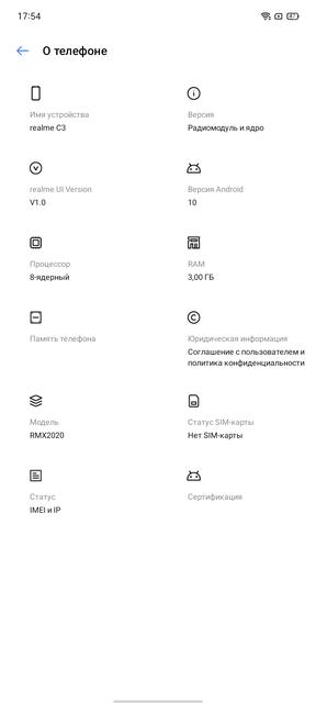 realme С3 — бюджетный Android-смартфон с 6.5-дюймовым IPS-дисплеем HD+, восьмиядерным процессором MediaTek, основной квадрокамерой на 12 МП и большим аккумулятором. Смартфон оснастили большим дисплеем с каплевидным вырезом для фронтальной камеры и небольшим разрешением HD+, что вполне ожидаемо учитывая демократичный ценник. За производительность отвечает восьмиядерный процессор MediaTek Helio G70 с тактовой частотой 2 ГГц и графическим ускорителем Mali-G52 2EEMC2. Оперативной памяти может быть 2, 3 или 4 ГБ, встроенной — 32 или 64 ГБ, есть отдельный слот для MicroSD. У нас конфигурация с 4 ГБ ОЗУ не продаётся (во всяком случае пока). Но, что интересно, у версии 3/64 ГБ есть модуль NFC для бесконтактной оплаты, у 2/32 ГБ — нет. Питается смартфон от внушительного аккумулятора на 5000 мАч, но быстрая зарядка не поддерживается, а для подключения кабеля используется MicroUSB. Работает смартфон на актуальной Android 10 с фирменной оболочкой Realme UI.