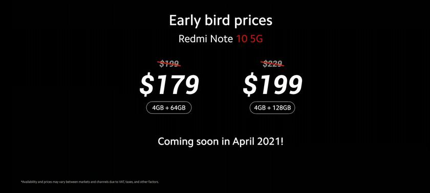- Redmi Note 10 5G 4/64 ГБ — $199 (цена на старте продаж $179)