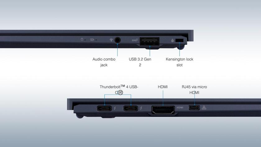 Лэптоп оборудован стереодинамиками Harman Kardon, двумя разъёмами USB-C с поддержкой Thunderbolt 4, USB-A (USB 3.2), HDMI 2.0b и Micro-HDMI. Ёмкость аккумулятора составляет 66 Вт*ч, чего, по словам производителя, достаточно для просмотра видео в течение 16 часов. Также стоит отметить, что новинка весит 880 г – на 360 г меньше, чем MacBook Air.