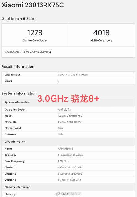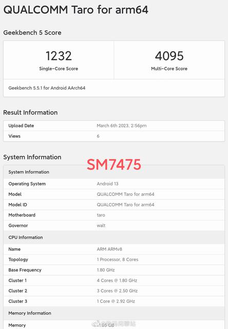 6 марта смартфон с чипом Snapdragon 7+ Gen 1 был протестирован в бенчмарке. Он набрал 1232 балла в тесте Single-Core и 4095 баллов в Multi-Core. В базе данных Geekbench 5 указано, что процессор имеет три кластера ядер с частотой 2,92 ГГц (x1), 2,5 ГГц (x2) и 1,8 ГГц (x4).