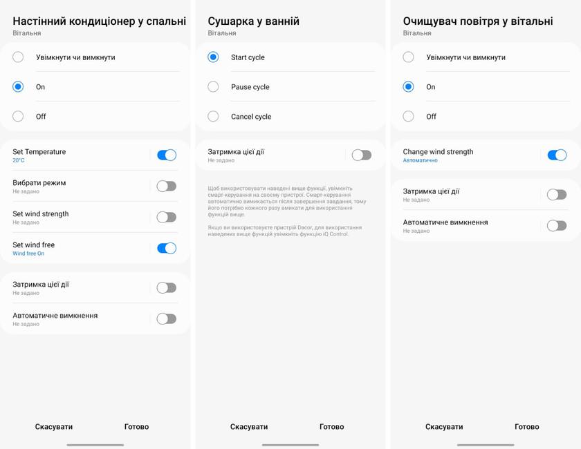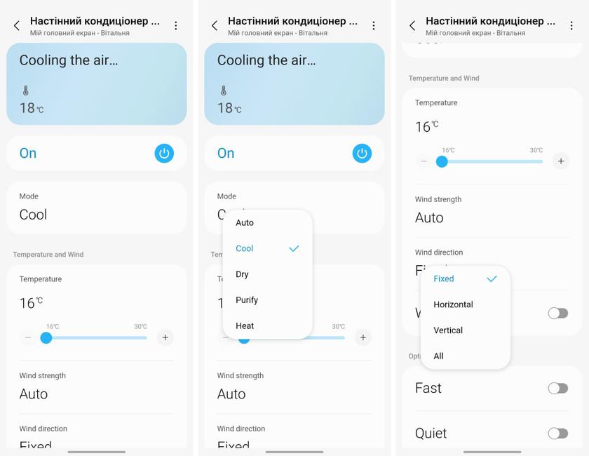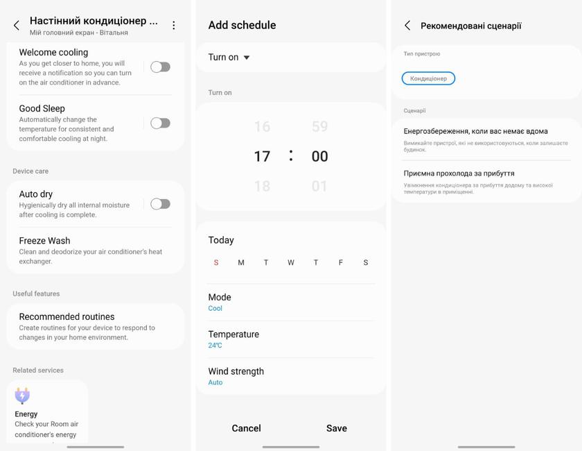 Еще один пример - умный кондиционер Samsung серии WindFree. Сначала кажется, что приложение только дублирует возможности пульта дистанционного управления: позволяет включать/выключать устройство, регулировать режимы работы и изменять температуру в доме. Но приложение позволяет еще менять режимы работы по недельному расписанию, получать уведомления и включать кондиционер при приближении к дому (Welcome Cooling), и включать рекомендованные сценарии, позволяющие экономить электроэнергию в то время, когда никого нет дома. При этом можно достичь разумного баланса, когда электроэнергия не используется впустую, при этом кондиционер может включаться перед тем, как пользователь переступает порог помещения.