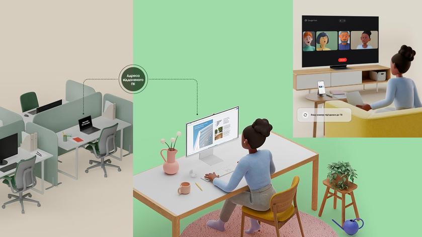Работа (к сожалению), все еще является важной частью нашей жизни. Поэтому SmartThings должен помогать с ней. Если вы являетесь, например, счастливым обладателем смартфона Galaxy, то вы действительно можете часть работы выполнять даже без рабочего ноутбука. Присоединиться к рабочей видеоконференции можно прям со смарт-телевизора (или смарт-монитора), а для видео использовать фронтальную камеру собственного смартфона (для этого, конечно, смартфон надо совместить с телевизором через приложение SmartThings). А еще можно легко отправлять файлы с телефона на Windows-ПК и дистанционно работать с ним, подключив клавиатуру и мышку к смартфону, и все вместе - к смарт-монитору.