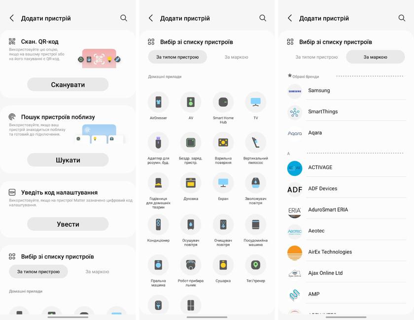 Чтобы добавить новое устройство, нужно запустить приложение SmartThings, выбрать раздел "Устройства" и нажать + в верхнем правом углу экрана. Если у вас устройство Samsung, скорее всего, оно само подключится к смартфону, и вы увидите всплывающее окно с предложением добавить устройство. То же самое происходит, если запустить сканирование устройств поблизости. Но можно сканировать QR-код на самом устройстве или выбрать его из списка (по типу или марке).