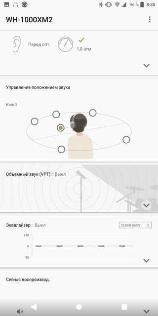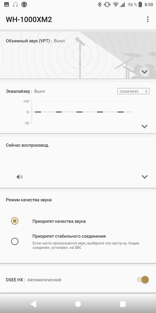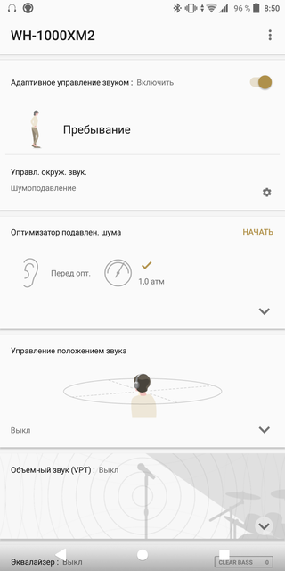 Есть фирменное приложение Sony Haeadphones Connect, которое отображает основную информацию (уровень заряда, используемый кодек, качество передачи и т.д) и позволяет очень гибко настраивать наушники по своему вкусу. Это касается как системы шумоподавления с внутренним давлением, так и самого звука: есть эквалайзер, эмуляция объёмного звука, улучшайзер DSEE HX, который (в теории) "дорисовывает" потерянное при сжатии в MP3. Есть адаптивный режим, в котором наушники определяют местоположение и тип деятельности (покой, ходьба) и сами подстраивают ANC в зависимости от ситуации:
