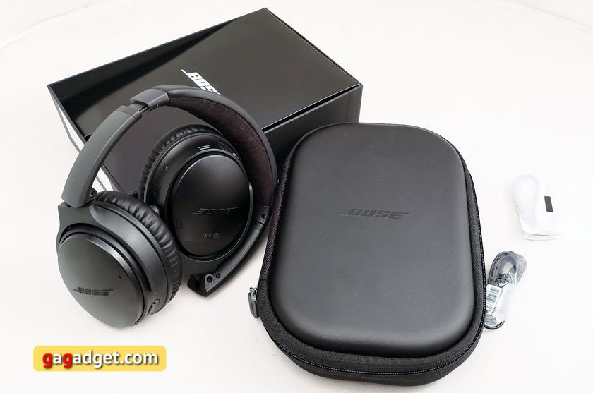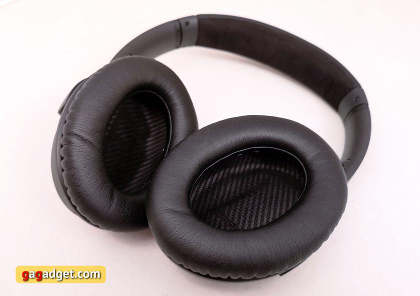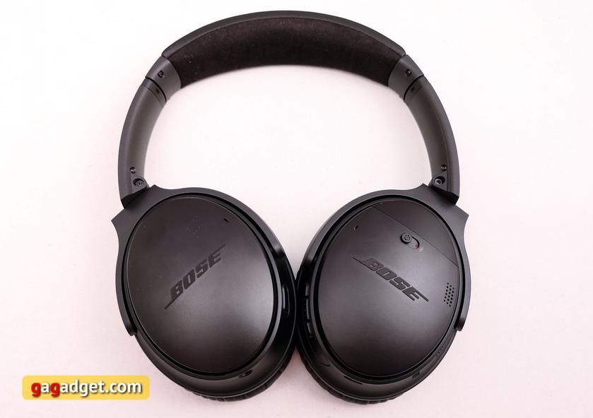 Наушники сделаны из пластика и металла (каркас), конструкция складная, как и у Sony WH-1000XM3. Чашки поворотные, внешняя их часть пластиковая и окрашена матовой краской. Выглядит дорого и красиво, но отпечатки собирает. На внешних частях чашек расположились микрофоны для активного шумоподавления и логотипы Bose. Для включения и режима создания Bluetooth-пары предусмотрен переключатель-ползунок на правом наушнике. На нём же спереди расположился разговорный микрофон и NFC-метка. Сзади — три механические кнопки управления воспроизведением с двумя светодиодами рядом. Снизу — MicroUSB для зарядки. На левый наушник вынесен разъём для проводного подключения и большая кнопка вызова Google Assistant. Её можно переназначить, что я сразу и сделал, в итоге с её помощью переключались режимы работы шумоподавления. На внутренней части оголовья есть мягкая вставка из алькантары. Амбушюры мягкие, внутри — пена с эффектом памяти, снаружи — кожзаменитель. Внутри чашек — обозначения левого и правого наушника. Гарнитура оказалась лёгкой, несмотря на это, дешёвой или ненадёжной она не ощущается. У нас побывала чёрная версия, бывает ещё серебристая.