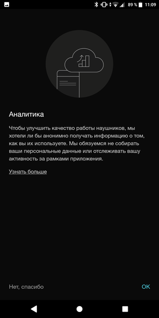 Фирменное приложение предназначено для настройки гарнитуры и выглядит довольно минималистично. Но почему-то долго запускается и подключается к наушникам. Есть индикатор батареи, возможность обновления прошивки, сброс, настройки шумодава и сенсоров. Система шумоподавления (Фильтр окружающих шумов) имеет три режима работы: офис, город и полёт, для каждого из них можно отрегулировать сквозной пропуск голосов. Ещё одна интересная фишка — сенсоры надевания: гарнитура автоматически ставит музыку на паузу если вы её сняли. Чувствительность сенсоров также настраивается: