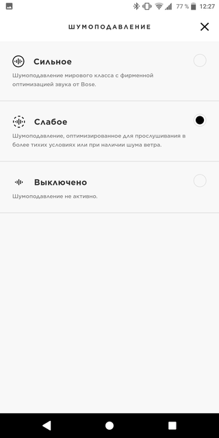 Есть фирменное приложение Bose Connect, в котором можно изменить название гарнитуры, переключаться между источниками, отрегулировать уровень шумоподавления, переназначить кнопку Google Assistant, просмотреть текущие данные по заряду, громкости и проигрываемому треку (в том числе подтягивается информация с Google Music) и включить голосовые подсказки. Уже есть русскоязычная локализация, хоть и кривоватая, со смешным акцентом: