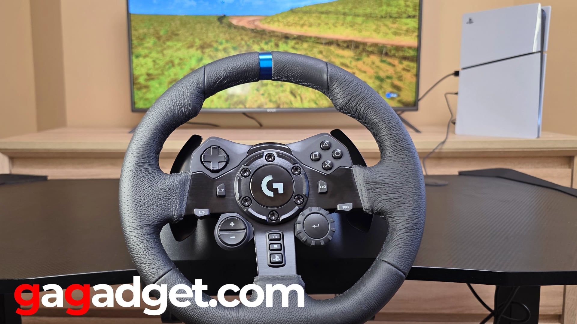 На руле расположены кнопки управления Playstation (у меня была такая версия, еще есть отдельная для XBox). Голубая лента дополнительно указывает на состояние руля в стандартном виде (он имеет самое большое в отрасли пространство для оборотов - 900 градусов, то есть два с половиной полных оборота). Ряд светодиодов указывает на текущее состояние оборотов в играх, поддерживающих эту функцию. А еще сразу за рулем есть трехпозиционный переключатель режимов работы - ПК, PS4, PS5. Головки винтов, закрепляющих руль за столом, утапливаются после фиксации - такой баланс между удобством (они должны быть достаточно большими, чтобы можно было крепко прикрутить) и незаметностью. 24-позиционный диск дополнительно позволять управлять настройками в игре: тяга, крутящий момент, тормозная сила. Все это зависит от возможностей и настроек игры.