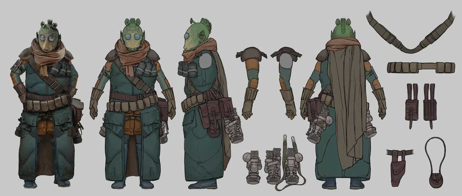 Иллюстрации происходят из портфолио художника, который недолго работал над проектом. Тринадцать изображений демонстрируют различных персонажей в различных костюмах и визуальных стилях. Три из них относятся к видам, хорошо знакомым поклонникам Звездных войн, о чем свидетельствуют названия файлов: Зенезианец, Родианец и Гунган - раса печально известного Джа-Джа Бинкса. Кроме того, представлены дизайны контрабандистов, каждый из которых имеет уникальный наряд и снаряжение.