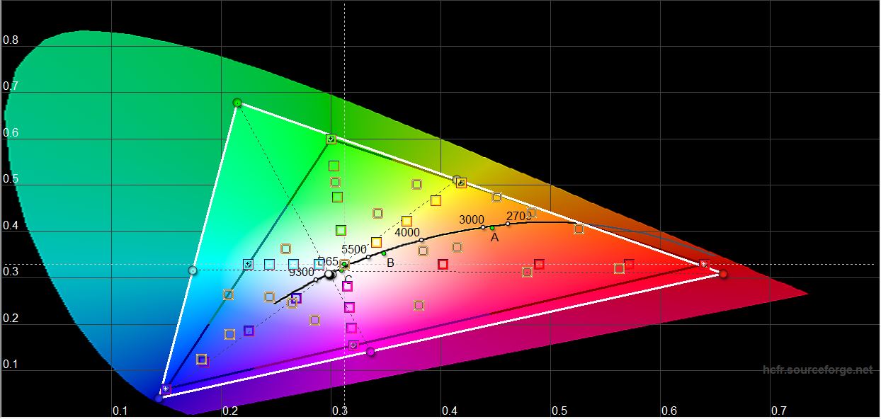 Экран яркий, с максимальными углами обзора, насыщенными цветами и глубоким черным. Из незначительных претензий - вышеупомянутая частота обновления 60 Гц. И глянцевое покрытие при ярких внешних источниках света будет немного бликовать. Аппаратные измерения показали, что максимальная яркость составляет 381.131 кд/м², что вполне соответствует заявленным показателям. Цветовой охват значительно шире, чем sRGB. Цветовая температура немного завышена, поэтому картинка немного акцентирована на прохладных оттенках.