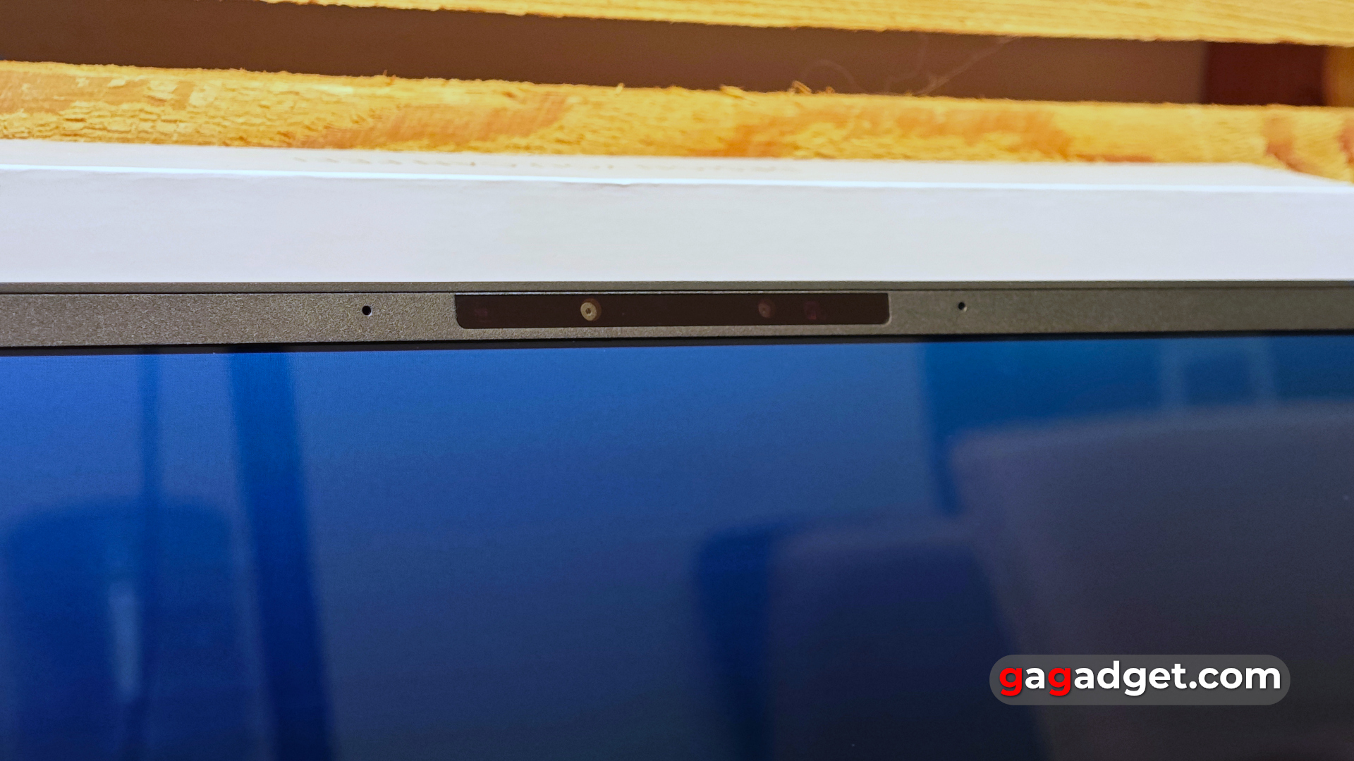 Экран не сенсорный, поэтому защитное стекло отсутствует, по периметру OLED-экрана- стандартная тонкая рамка из черного пластика. Над экраном - веб-камера в разрешении FullHD с индикатором, микрофоны, инфракрасная камера для распознавания лица владельца, а также датчики освещения и цветовой температуры.