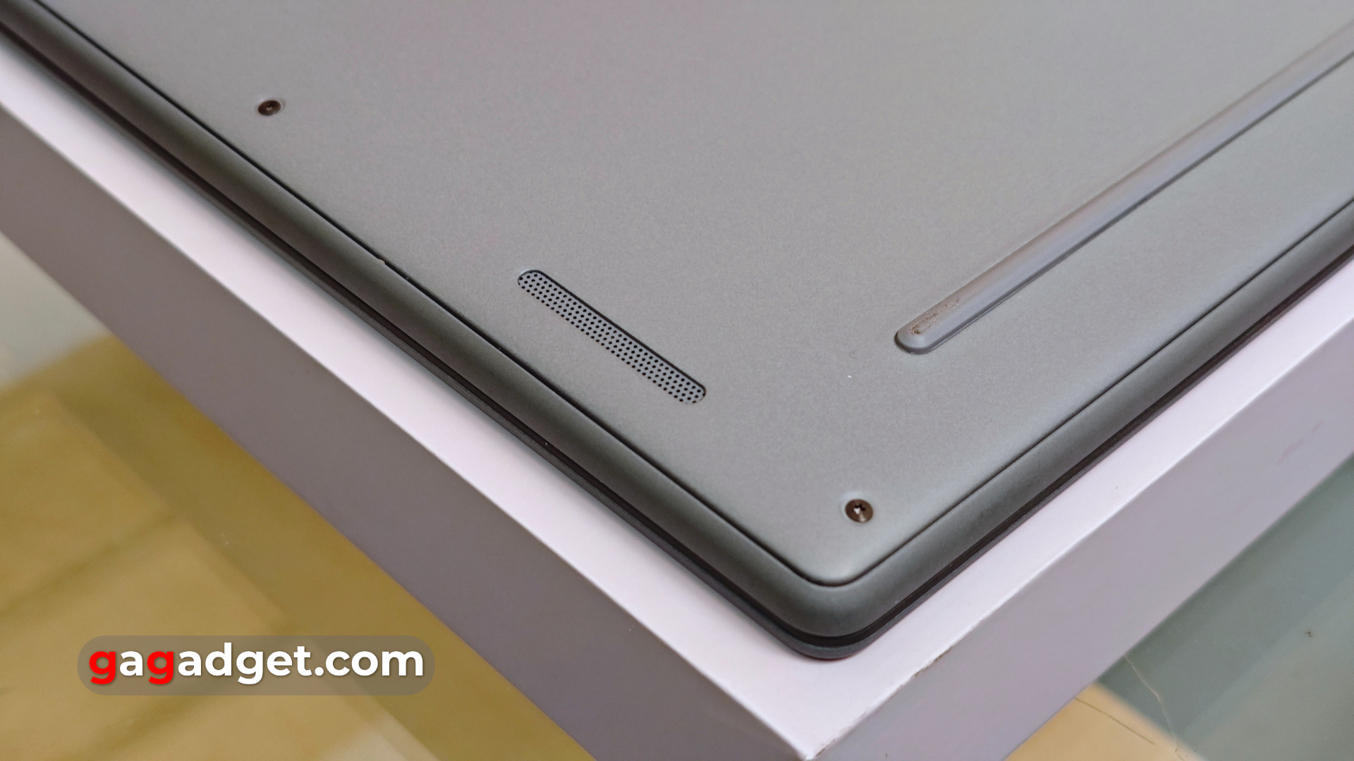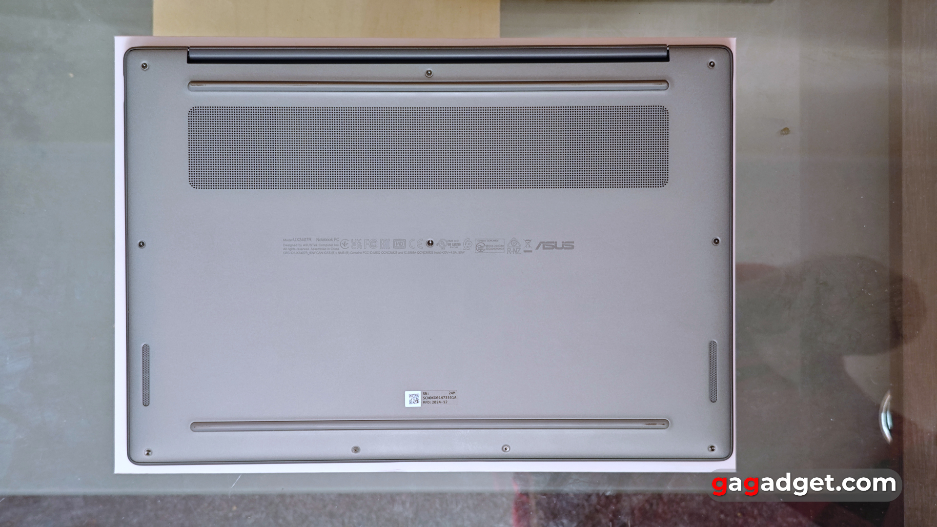 Снизу ASUS Zenbook A14 все вполне стандартно. Две резиновые полоски, предотвращающие скольжение ноутбука по столу, вентиляционные отверстия, а также стереодинамики. Они размещены почти горизонтально. Нижняя крышка закреплена большим количеством винтов, что немного усложняет ее снятие. Но заменить можно лишь SSD, поэтому критической необходимости в этом нет.
