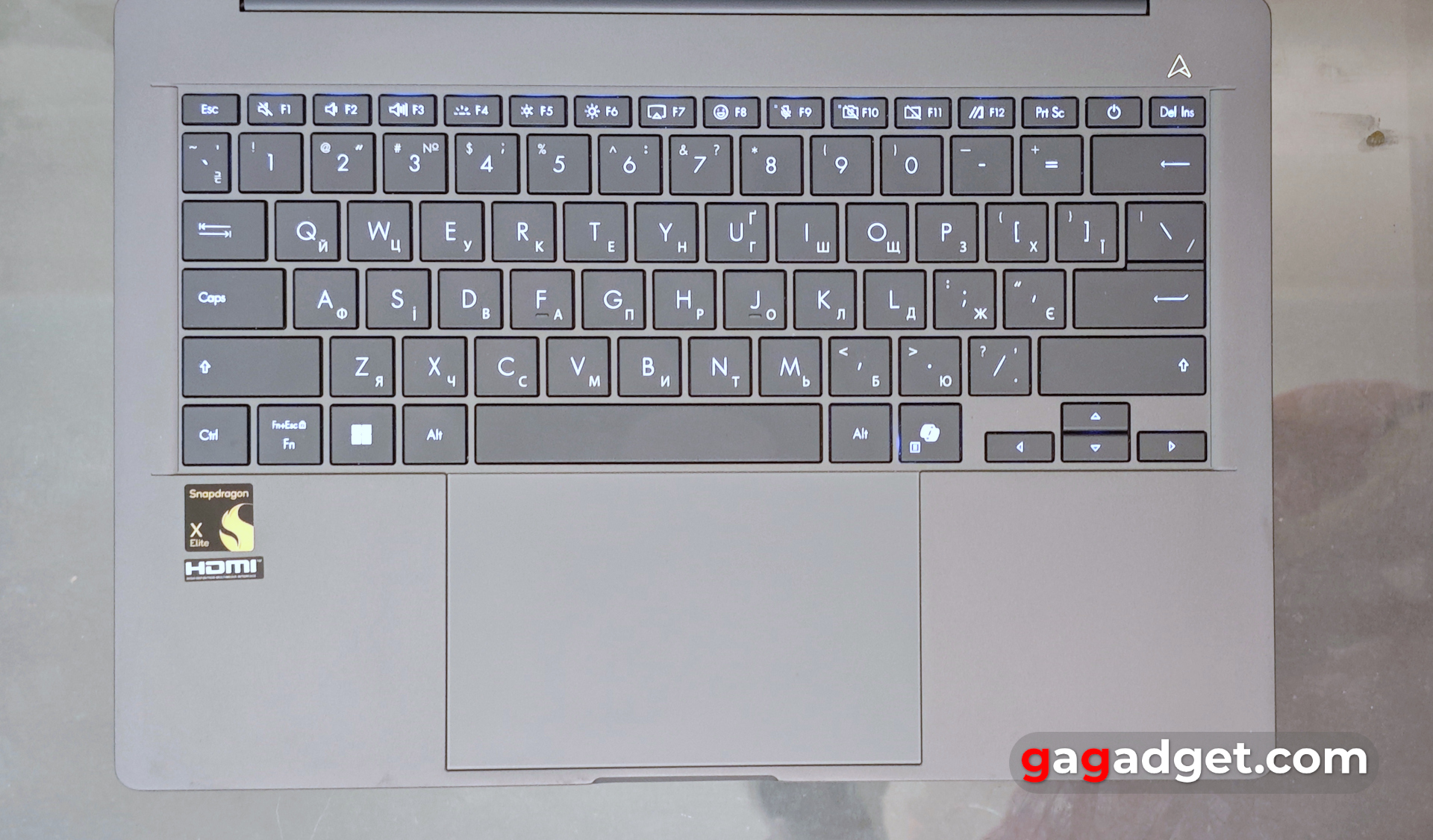 ASUS Zenbook A14 имеет приятный шарнир EasyLift, позволяющий открыть ноутбук одной рукой, плавно двигается на всем диапазоне и хорошо фиксирует дисплей. Раскладка клавиатуры стандартная для ультрабуков: полноразмерная без дополнительного цифрового блока. Из особенностей стоит упомянуть, что кнопка питания предпоследняя в верхней строке функциональных клавиш. Это сделано для уменьшения количества случайных нажатий на нее. Ряд заканчивается клавишей Del/Ins. Верхний ряд, как и навигационный блок, уменьшены по высоте. Рядом с навигационным блоком размещена кнопка быстрого запуска ИИ-ассистента Copilot. Оба Shift и Enter длинные. Раскладка удобная и не требует длительного времени на привыкание.