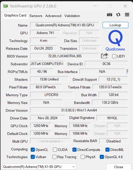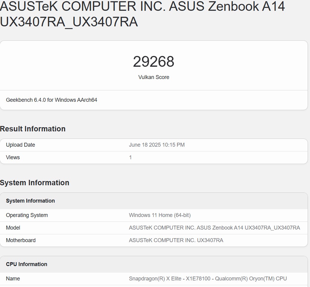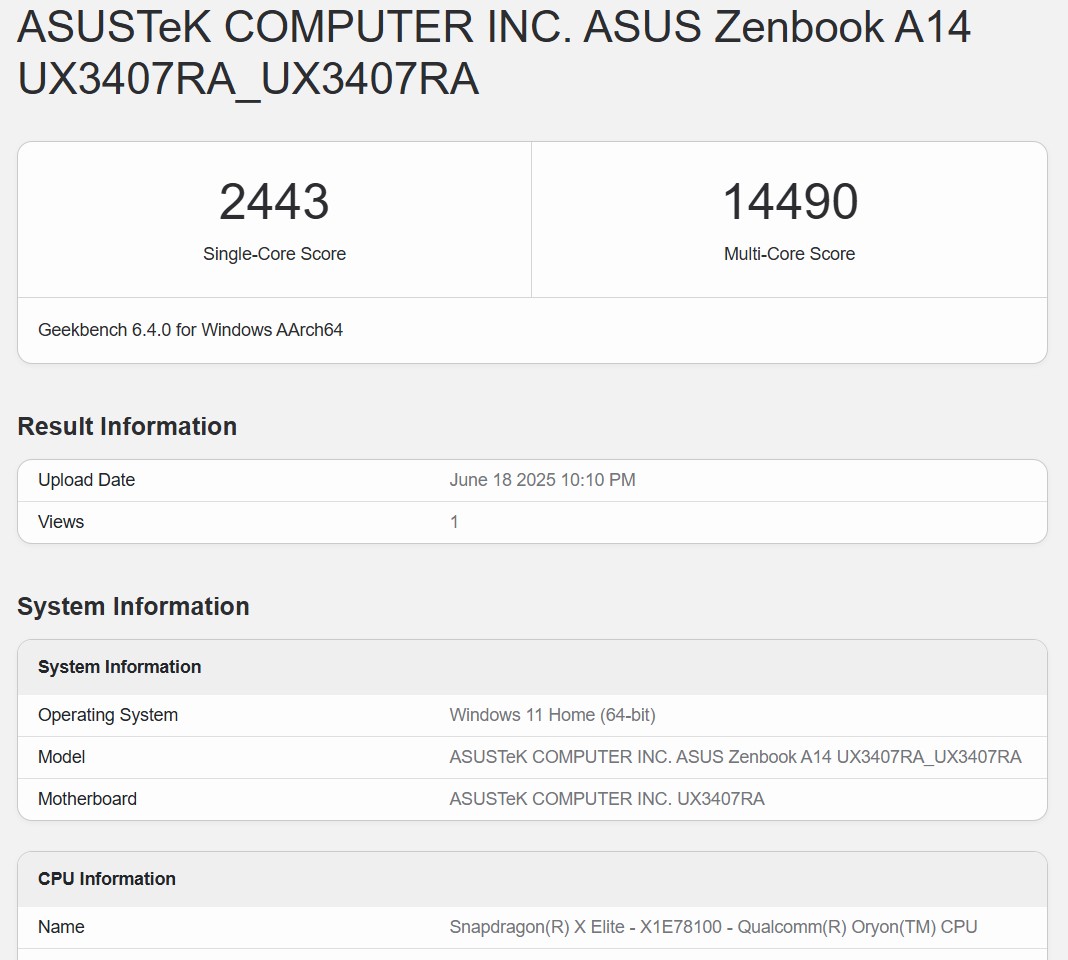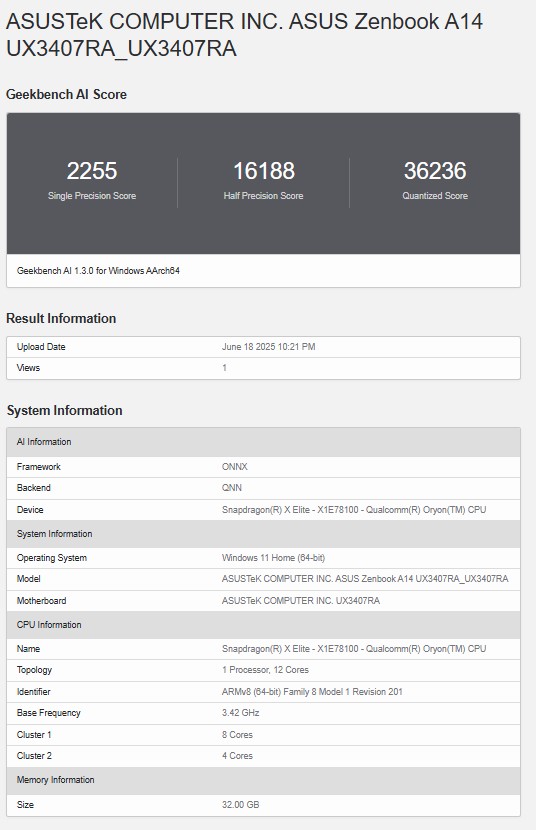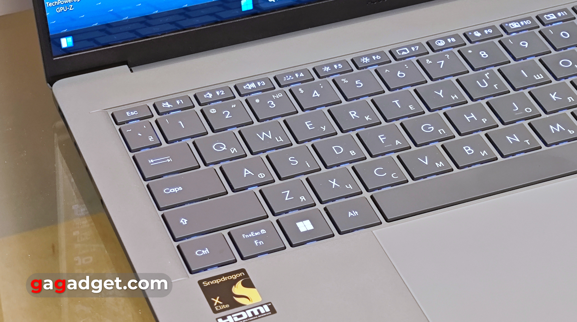 Одной из основных особенностей ASUS Zenbook A14 является использование процессора на архитектуре ARM, а не x86. К нам на обзор приехала топовая версия с процессором Snapdragon X Elite X1E 78 100, имеющим 12 ядер и способным обрабатывать до 12 потоков. Максимальная частота составляет 3.4 ГГц, кэш 42 МБ. Нейропроцессор Qualcomm Hexagon NPU имеет производительность 45 TOPs, а встроенная графика Adreno - 3.8 TFLOPS. Максимальный уровень TDP процессора - 45 Вт. В линейке процессоров Snapdragon X Elite есть чуть более мощные модели с более высокой максимальной частотой и поддержкой технологии Dual Core Boost. Но ASUS Zenbook A14 доступен только в двух конфигурациях, младшая получила более скромный Snapdragon X X1 26 100. Snapdragon и ASUS акцентируют внимание на возможностях нейропроцессора для работы с машинным обучением и генеративным ИИ. Microsoft постепенно расширяет возможности ИИ в Windows. Кроме Copilot, есть Recall (сохранение истории действий на ПК), Live Captions (субтитры в реальном времени), Cocreator (генерирование изображений), эффекты Windows Studio для видеозвонков, масштабирование Automatic Super Resolution и тому подобное. Плюс собственные инструменты ASUS вроде ИИ-шумоподавления и приложения StoryCube для упорядочения фото и видео.