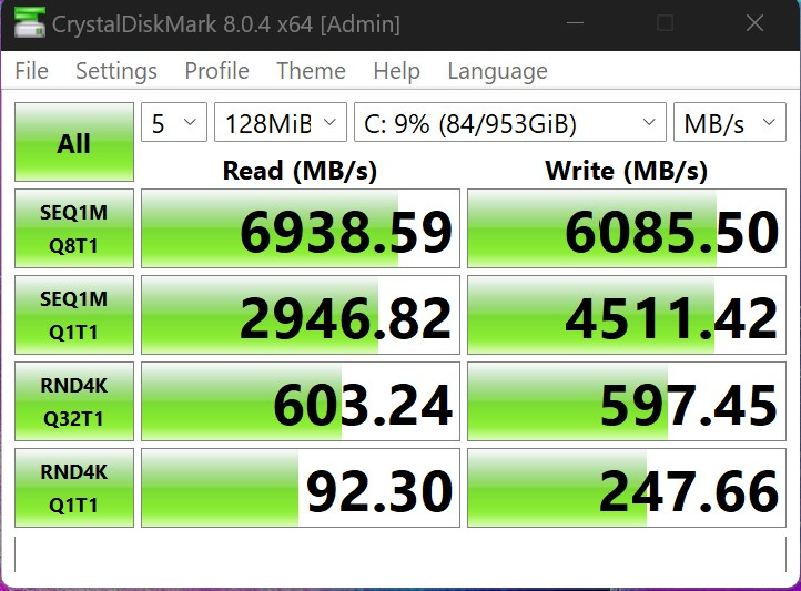 В качестве накопителя используется быстрый M.2 2280 SSD с интерфейсом PCIe 4.0 x4 объемом 1 ТБ. Скорость считывания достигает 6900 МБ/с, а записи - около 6100 МБ/с.