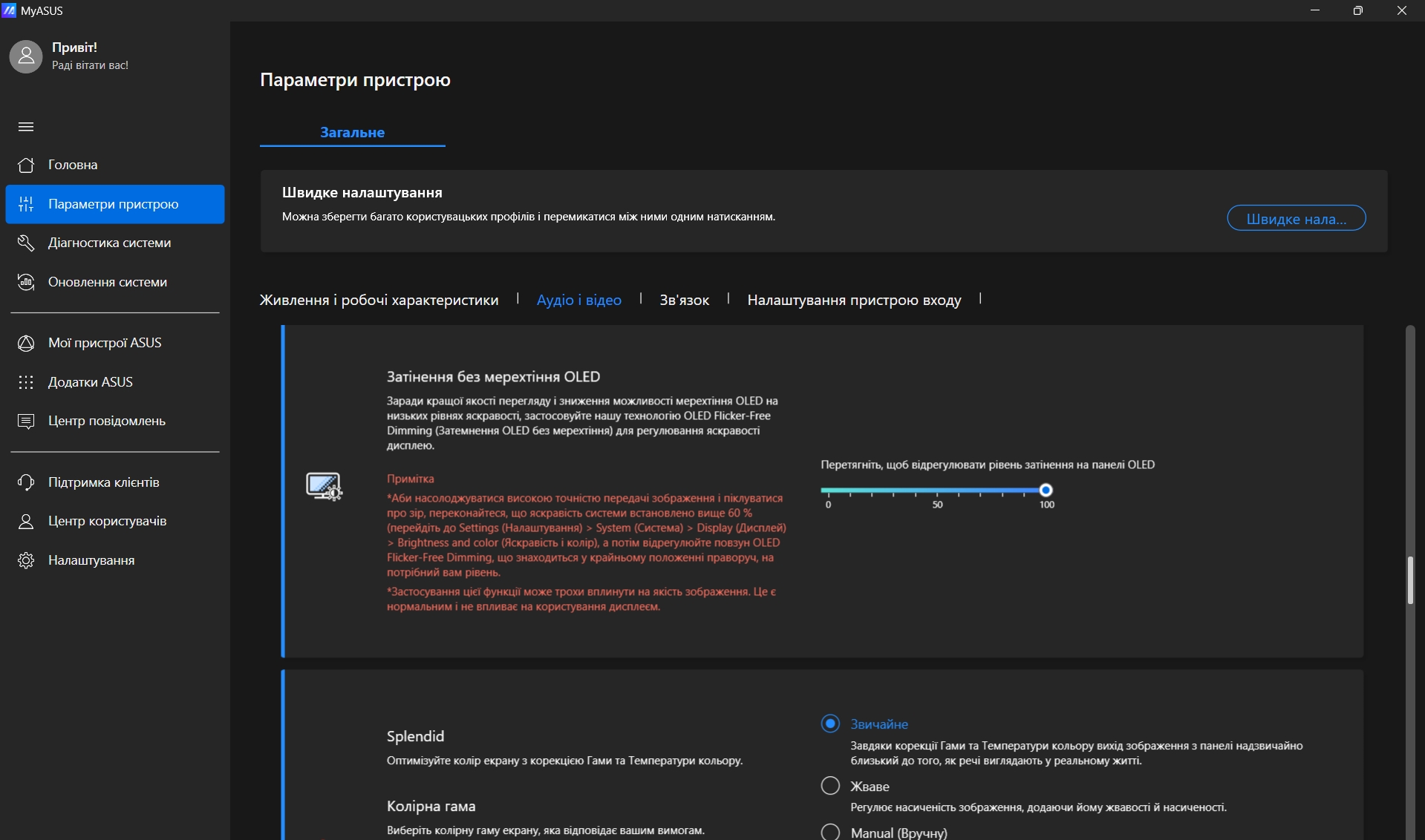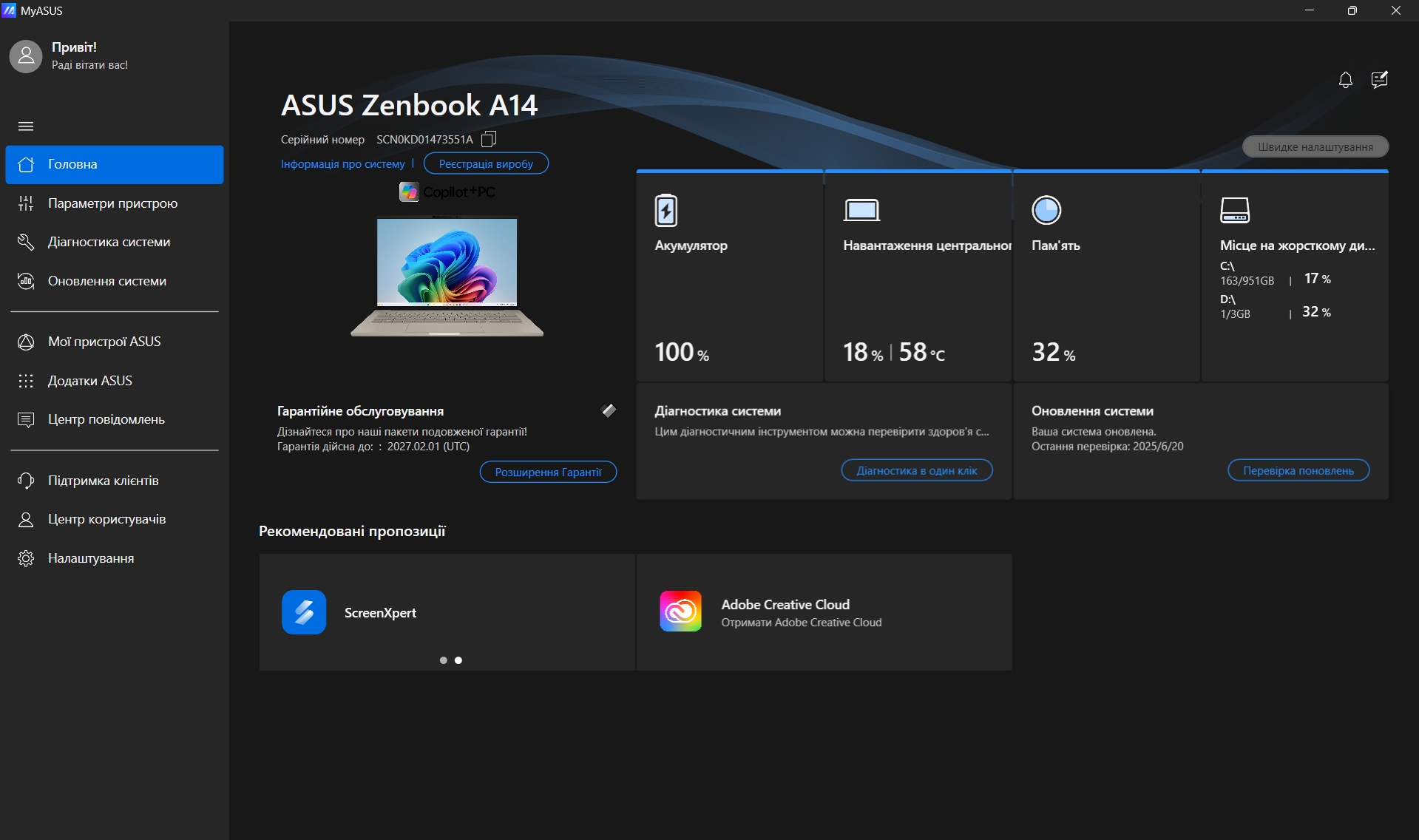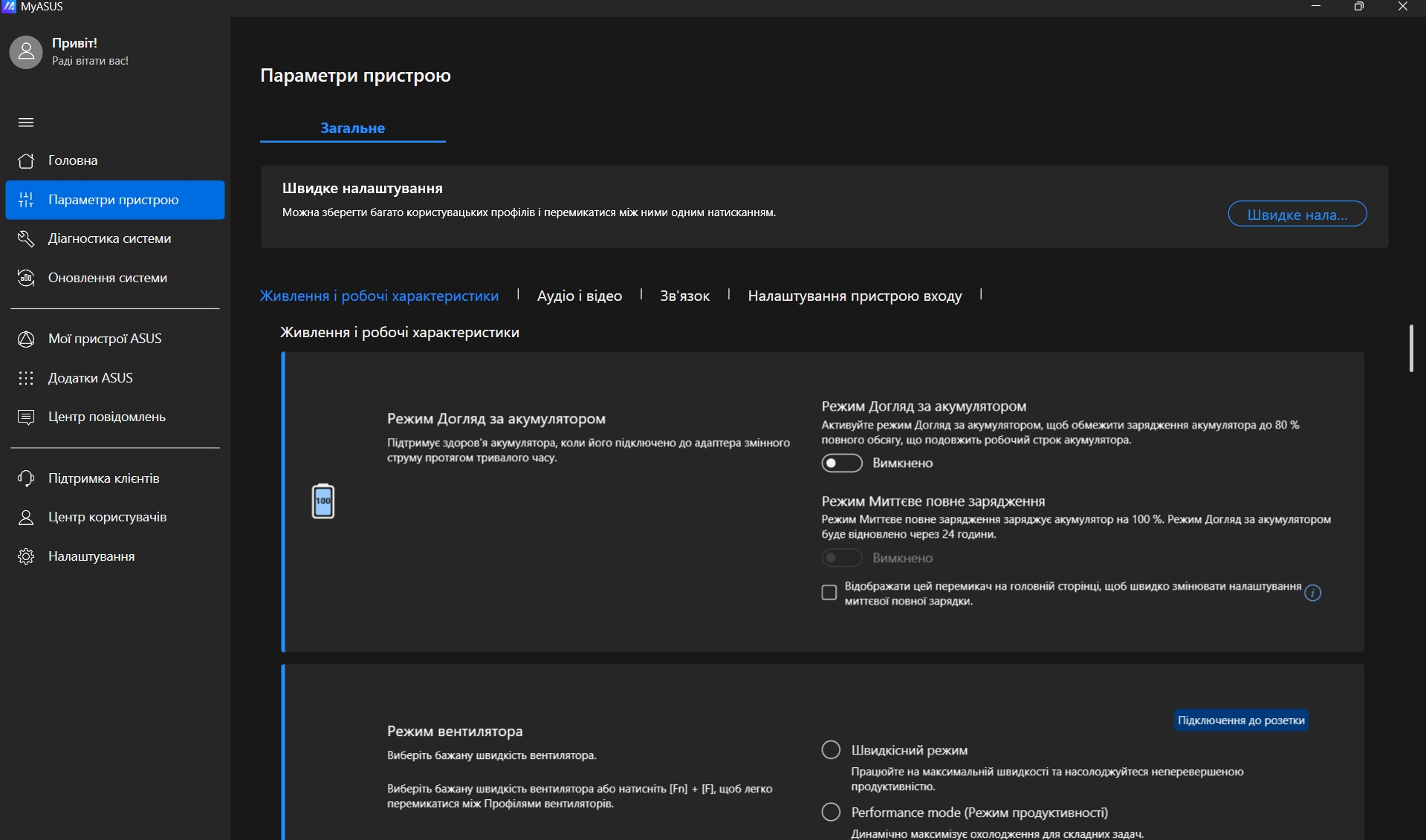 Основным приложением для большинства настроек ноутбука является MyASUS. Есть настройки системы охлаждения, производительности, ухода за аккумулятором (неполная зарядка для продления срока службы), диагностика оборудования, настройки дисплея, микрофонов, динамиков, шумоподавление на основе ИИ, автоматическая яркость, обновление системы и т.д.
