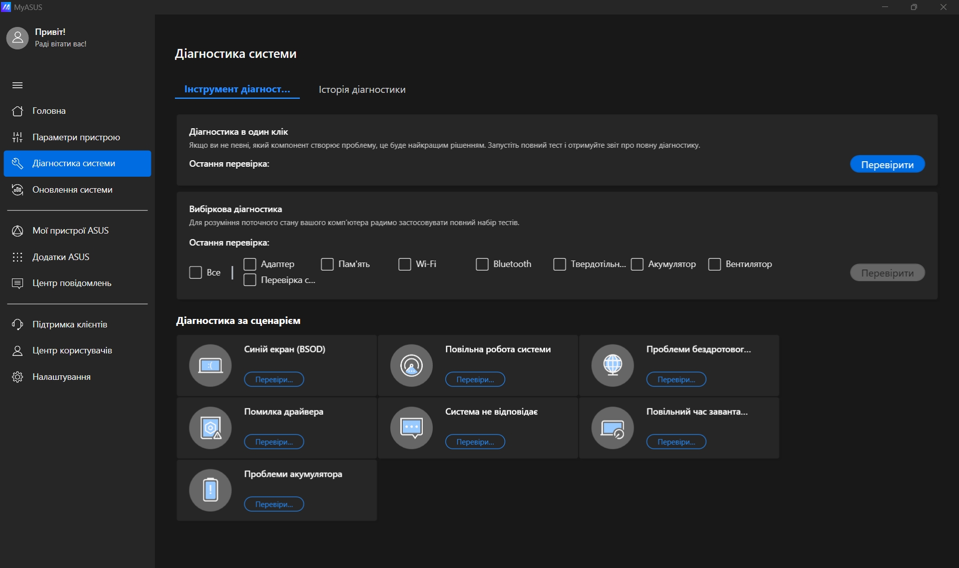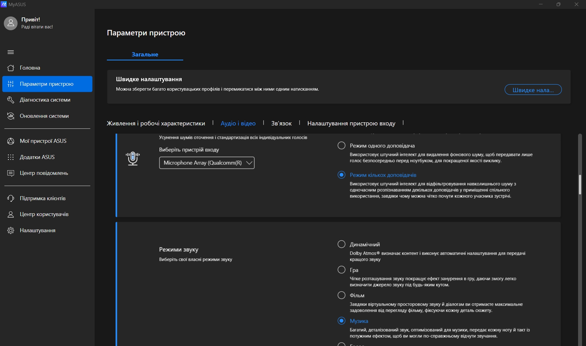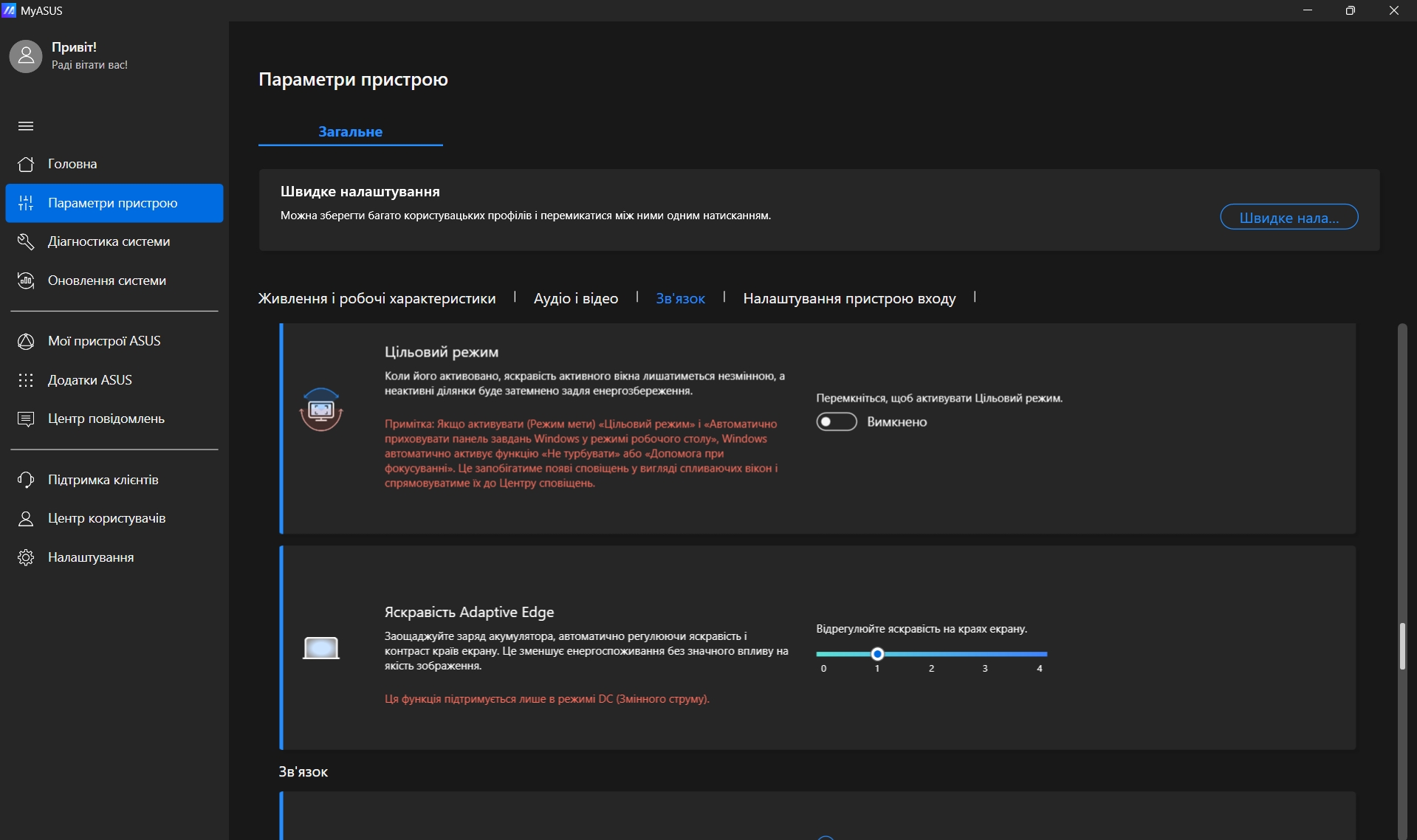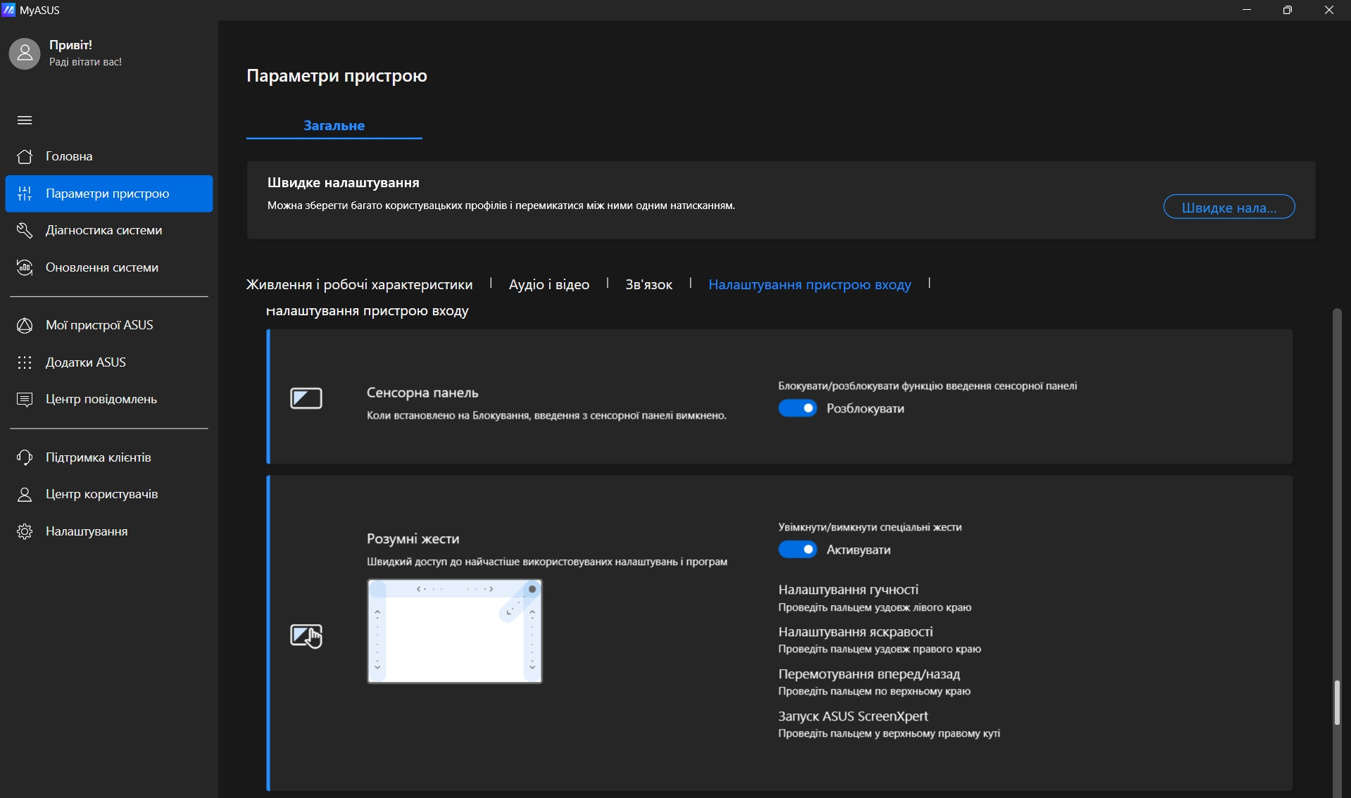 Основным приложением для большинства настроек ноутбука является MyASUS. Есть настройки системы охлаждения, производительности, ухода за аккумулятором (неполная зарядка для продления срока службы), диагностика оборудования, настройки дисплея, микрофонов, динамиков, шумоподавление на основе ИИ, автоматическая яркость, обновление системы и т.д.