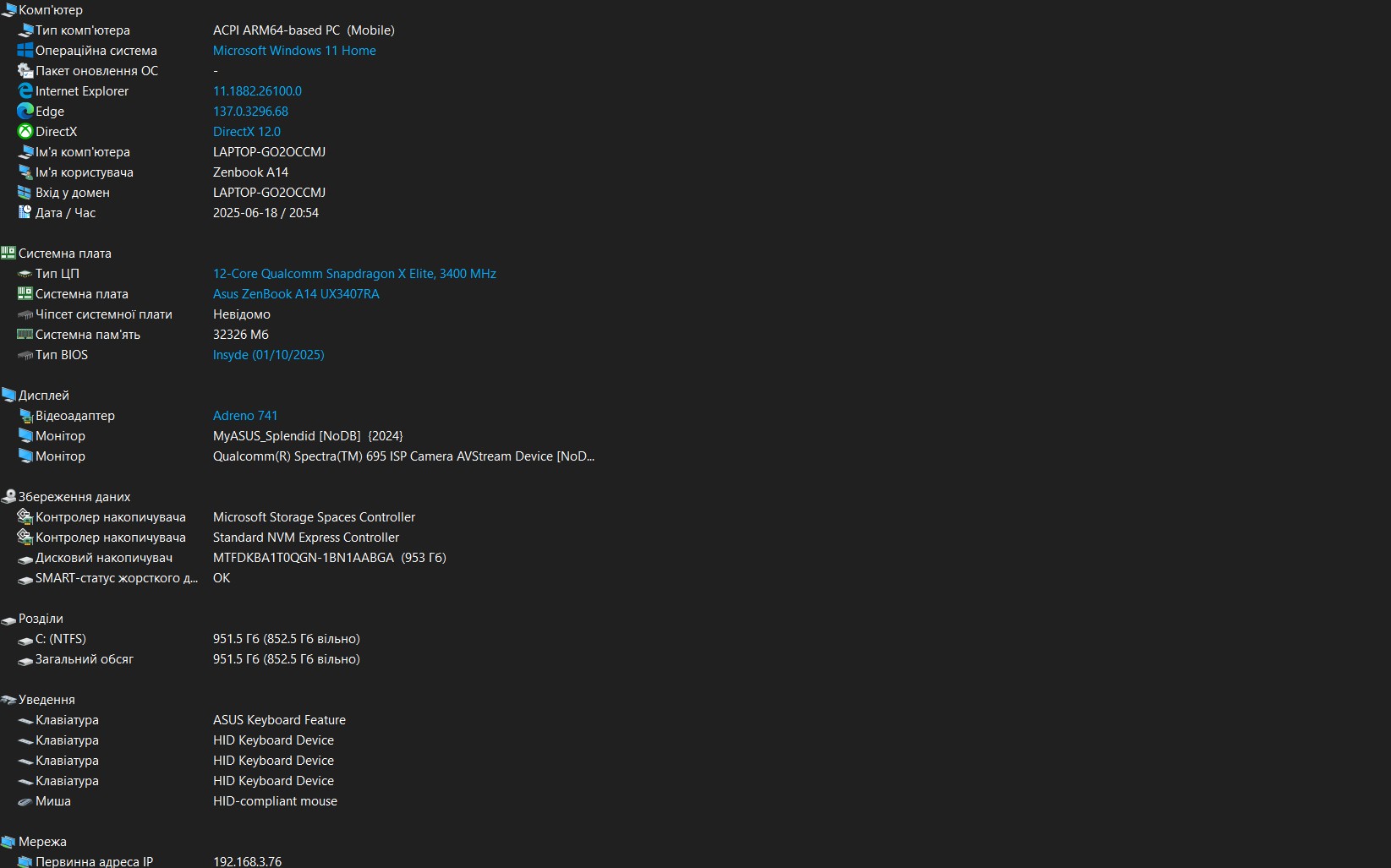 ASUS Zenbook A14 имеет 32 ГБ оперативной памяти LPDDR5X, она распаяна на плате. Ноутбук имеет поддержку новых скоростных стандартов беспроводной связи: Wi-Fi 7 (802.11be) (трехдиапазонный) 2*2 + Bluetooth 5.4.