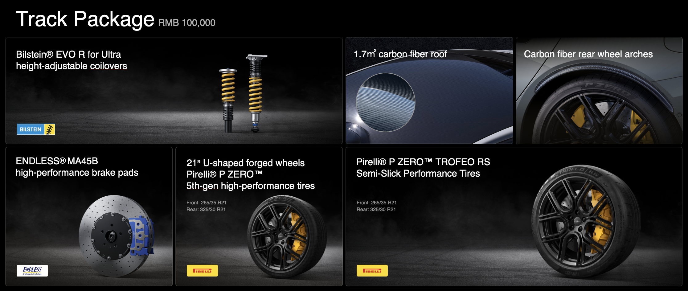 Молодой автомобильный бренд из Китая отметил очередной рекорд двумя новыми специальными сериями автомобилей. Первая представляет собой опциональную конфигурацию Track Package стоимостью 100 000 юаней (примерно 13 950 долларов США). Она добавляет SU7 Ultra высокопроизводительный аккумулятор трекового класса, улучшенное охлаждение, оптимизированные тормоза, настроенные для Нюрбургринга компоненты подвески и максимальную скорость 350 км/ч.